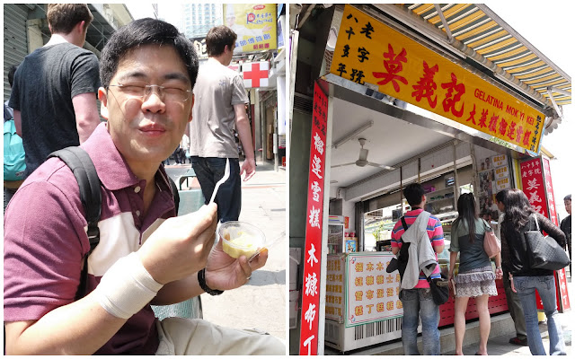第一站是地堡街路口的莫義記,招牌是榴蓮雪糕,可惜榴蓮向來不受我倆的青睬,被鋼牙龍雀屏中選的是芒果布丁,看他滿足的表情就明白有多合他的胃口,而我來了一杯楊枝甘露,不太冰冷也不太甜膩,解渴又有好滋味。