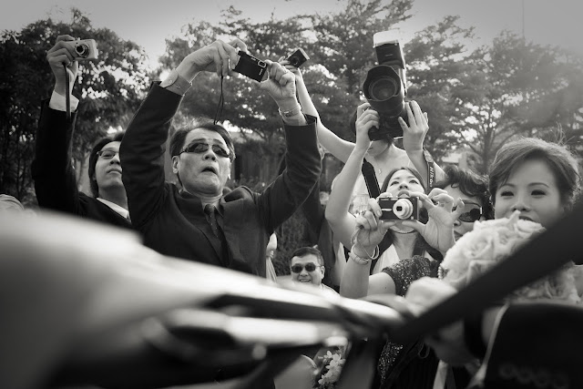 一場婚禮有很多角色,一個新郎配上一個新娘在多半情況下是鐵的定律,但是角色混淆偶爾還是會熱情上演。我和大龍的婚禮,其實已經精挑細選了專業的攝影師團隊,結果不知道是新娘太驚人美艷還是新郎太帥氣挺拔(其實明明只是地點風光明媚),一堆明明是請來享受的賓客,偏偏全都舉起相機,排山倒海卡個好位置搶當攝影師。