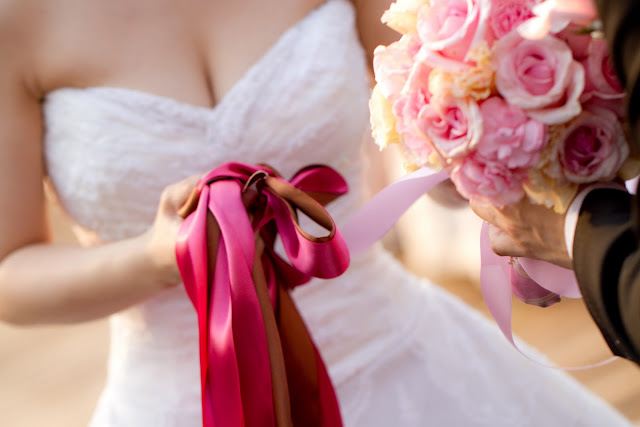 處理捧花對很多新娘應該都是個難題,當然只是因為單身,就被強迫要到台前揀捧花的女朋友們也是非常難為情,所以拉線抽捧花這個巧思真的算是近年最偉大的發明之一,我就直接揀來使用,不過最後一個禮拜才找到滿意的粉紅色和咖啡色寬版緞帶,為了要搭配婚禮主題的冰淇淋和巧克力,時間緊迫到有點小驚險就是了。