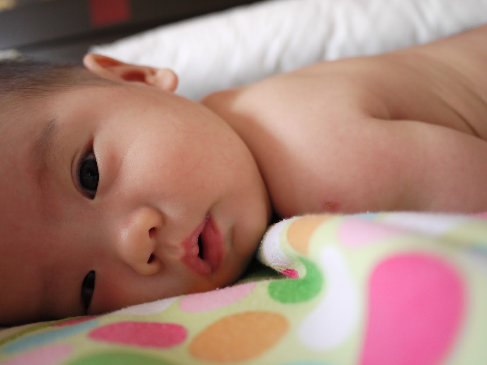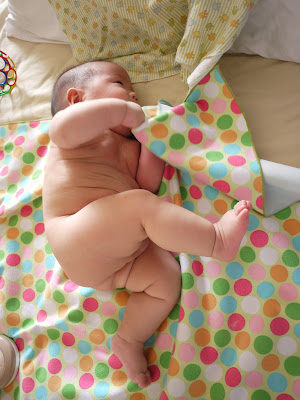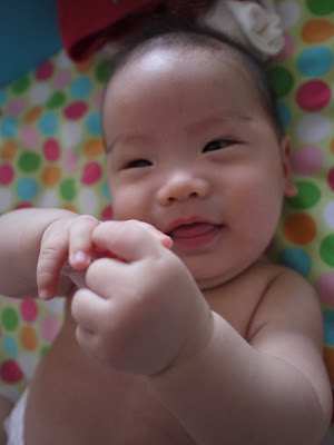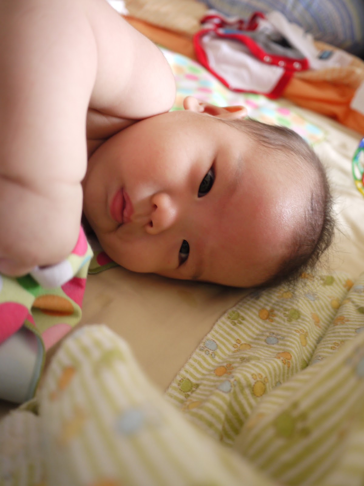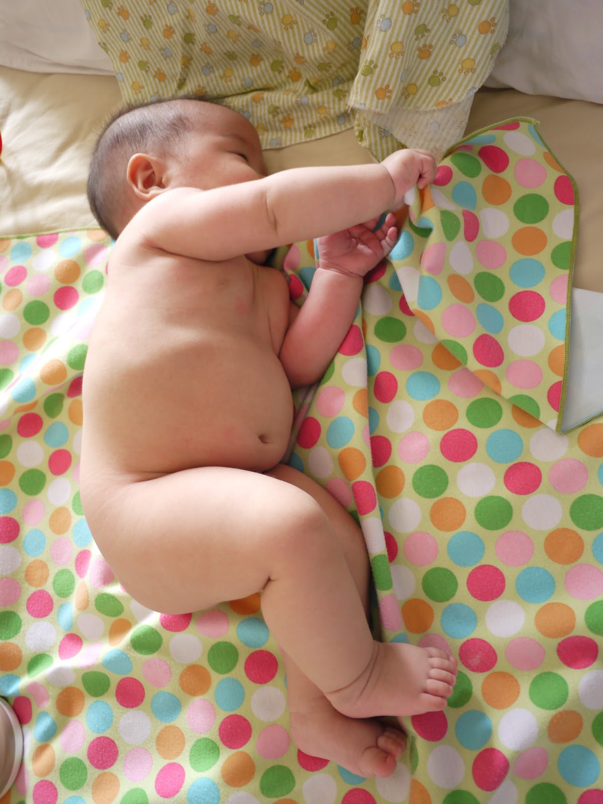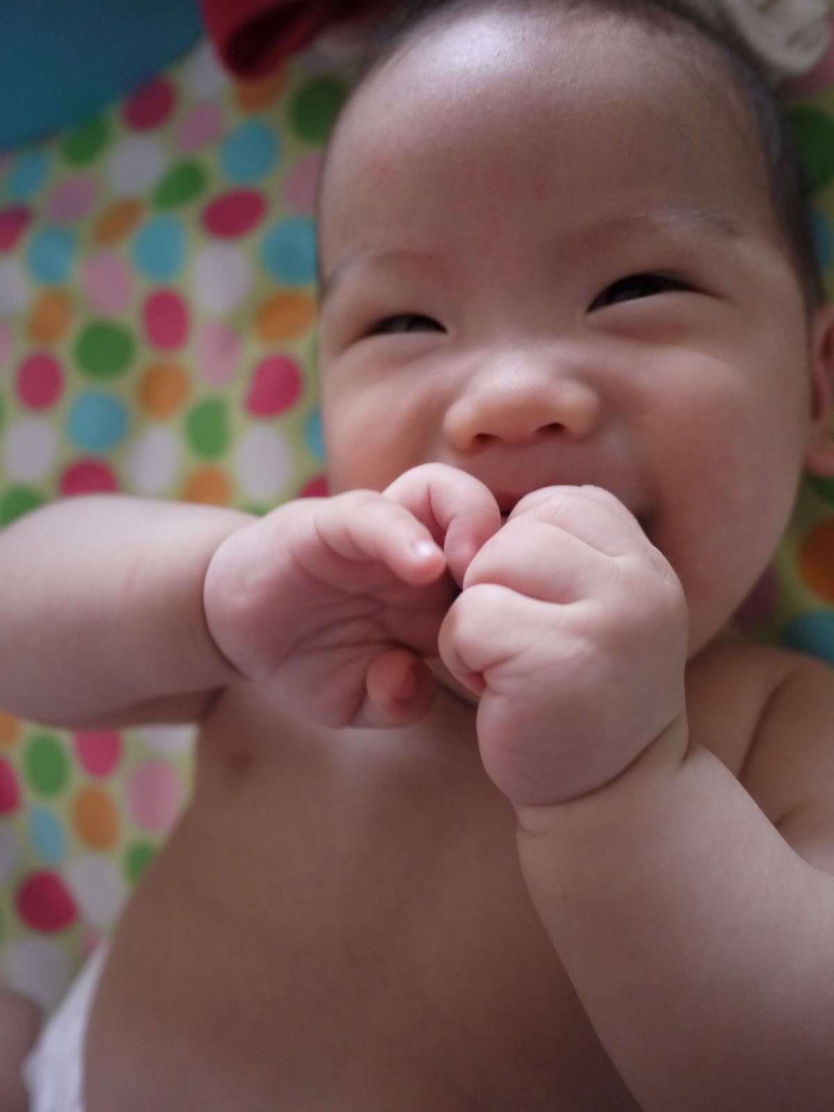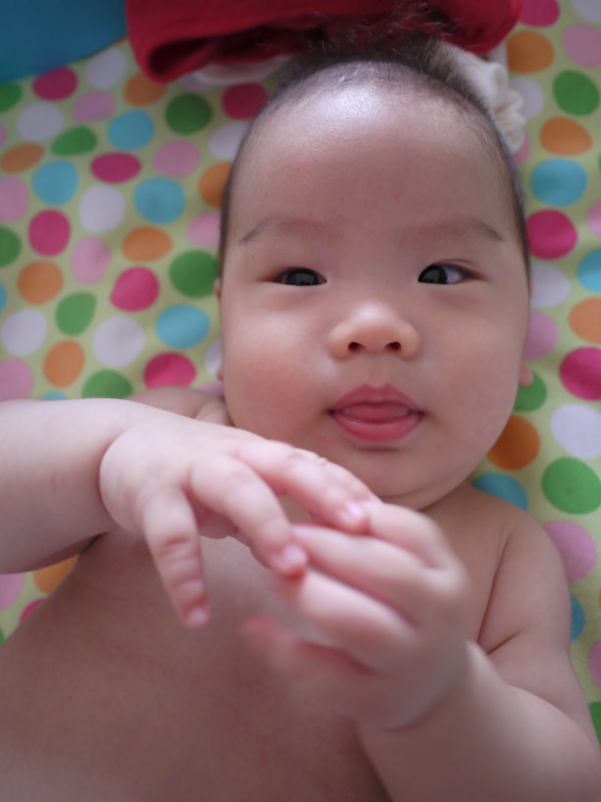 滿四個月了,成熟一點的肥肥安大方不少。以往洗澡後,都要記得拿取布料遮蓋他的身體,不然鐵定要聽他吼叫抱怨,然後發怒委屈大哭鬧。如今終於接受自己裸體這件事,願意曬曬鮮肉,提供攝影素材也可以。心情好起來的時候,逗兩下就開口咯咯笑,被拖來翻去都欣然接受,累了就趴下休息五秒(是的,嬰兒蓄電力無敵強。)然後起來再繼續衝刺繼續扭。