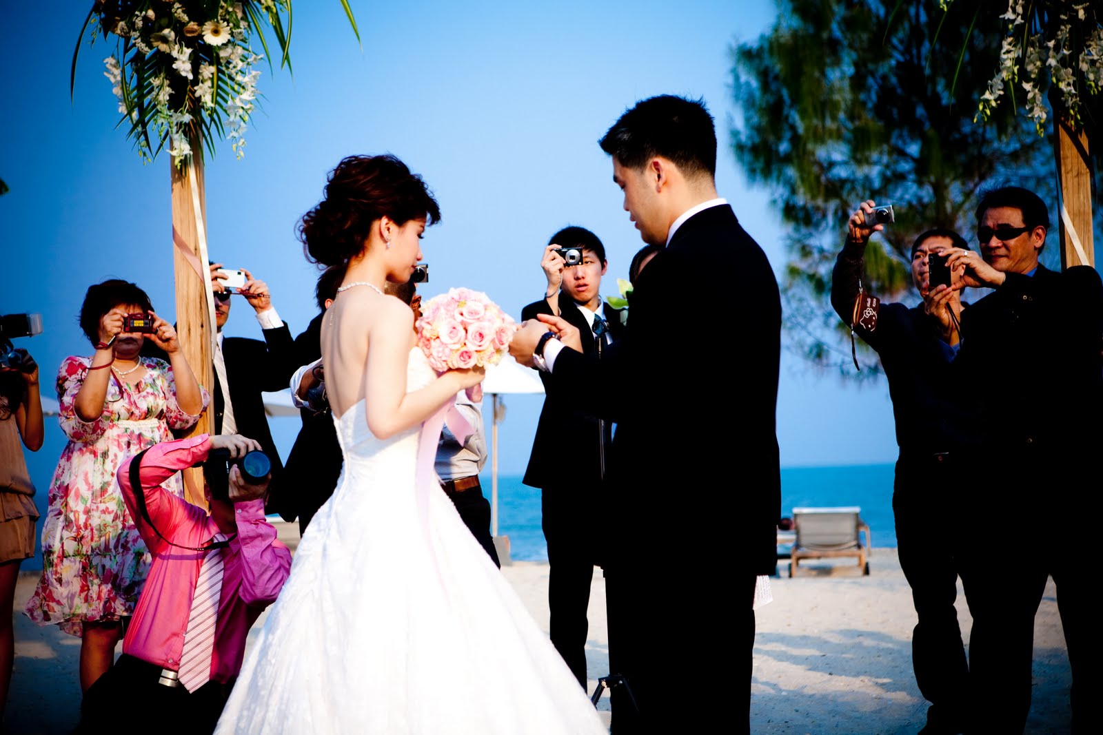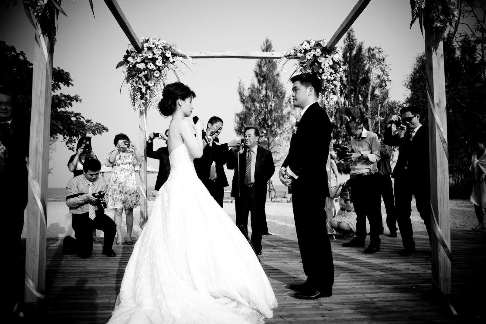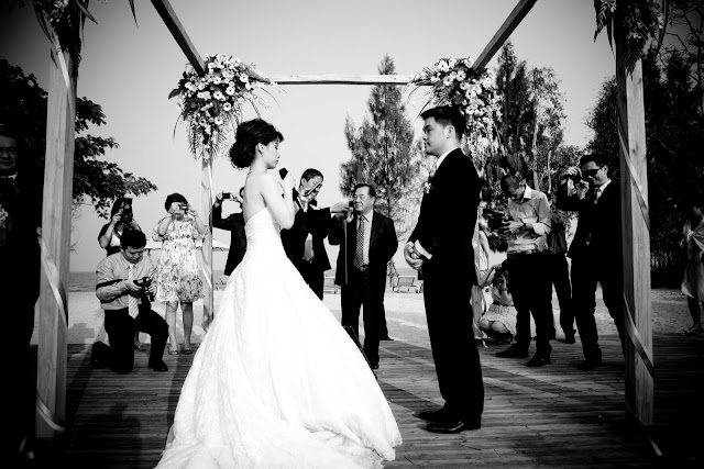 結果出乎意料之外,證婚人呂伯伯真的好會說話的,除了看到新娘那麼可愛太緊張把我的名字簡稱叫做“辛怡”幾次之外,整個就是很垂淚的一段祝福啊!龍先生和我都太投入的在聽著呂伯伯的證婚致辭,龍先生一臉嚴肅,而我則是沒多久就開始飆淚,導致婚禮背景由原本的浪漫海灘變成遍佈搶拍新娘的攝影朋友們。