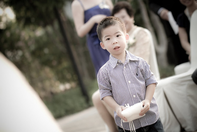 高潮迭起接著誓言交換,就是可愛的小菜頭弟弟要把婚戒遞給我們,話說自從小菜頭七個月和他相識以後,偶爾見面總是有個這麼可愛的孩子非得要綁架回家的念頭,偶爾我和大龍還會自己玩起蠟筆小辛的語氣學諾諾低重音說話,“叔叔,你老婆老漂亮噢。” “阿姨,妳頭腦壞掉了。” (哪對夫妻那麼幼稚 XD)