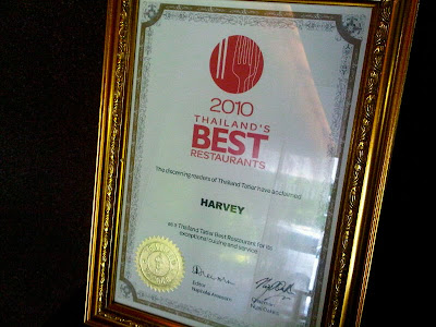 太隨意的夫妻倆沒有訂位就闖進去,在等候區坐了一會兒,照東照西的同時,看到了下面這個牌子,原來HARVEY獲頒為泰國2010年最佳餐廳之一。我摸著我的天地良心,在曼谷美味也夠水準的各國料理和餐廳幾乎是(和孫云云的柏金包一樣)永遠都有更加新更加好好味的餐廳一再突破,所以能獲得如此獎項的肯定,看來這一躺臨時起意的午餐應該不會讓人失望。