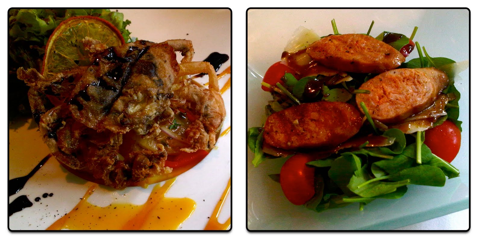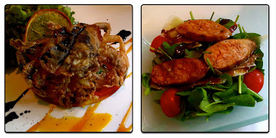 前菜上桌的分別是軟殻蟹沙拉和義式辣腸沙拉,不知是否吃多了KFC的香脆雞皮,軟殻蟹的酥脆程度感覺不夠卡兹卡兹,不過搭配那些看起來像是裝飾用的蔬菜和乾橘片還是讓我很快的就清空了盤子。而義式臘腸的味道雖然說不上夠味,卻有種一早新鮮灌好香腸的錯覺,再一次,搭配菠菜和醬料剛剛好的滿足。