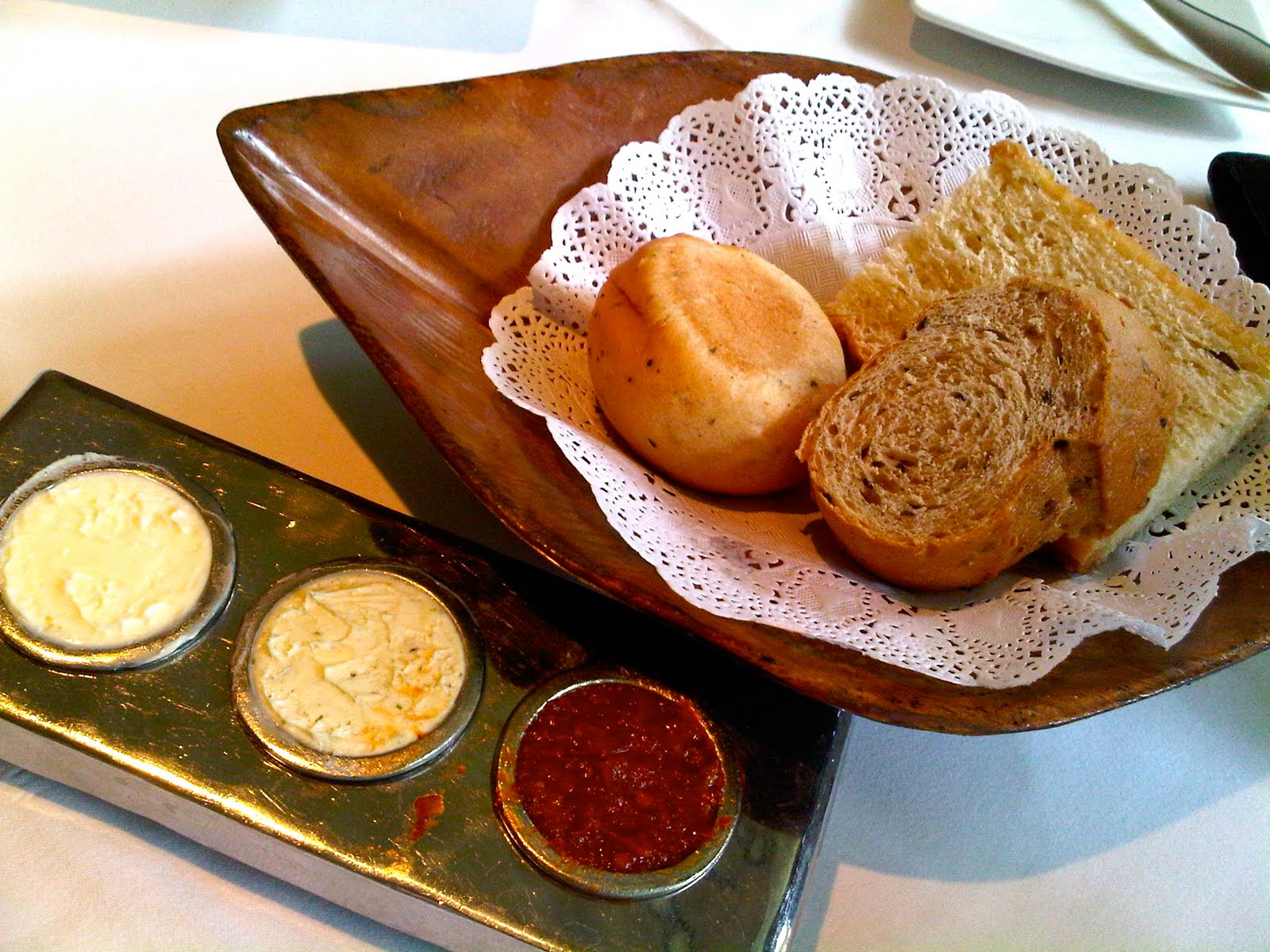 麵包一上桌,我就知道龍先生說的“墊墊肚子”會墊的相當高,除了溫熱麵包外酥內柔軟,麵包沾料也是品質高做工細的不可抗拒之美味,有純奶油,大蒜奶油,還有salsa sauce,每一口非得要在麵包上塗的夠豐富才滿意地放入口中,一邊咀嚼一邊露出陶醉的表情。