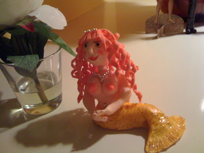 前天又跑到隔壁鄰居家去撒野, 這個禮拜歡度的是男主人的生日(, 所以有好多喝不完的酒)。女主人的姊妹淘有一個美麗的韓國太太, 她做了一個超級無敵好吃的核桃蛋糕, 不過更讓人垂涎三尺的是蛋糕上面還有一條巨胸細腰的美人魚, 從頭髮皇冠項鍊乳暈肚臍環, 到眼線口紅腮紅指甲油, 全部都是手工製作完成。韓國太太還同場加映了她和女兒的對話: