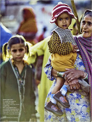 這幾天中外媒體都報導了一則所謂時尚界侮辱窮人的新聞, 事情的源頭就是印度VOGUE雜誌用了印度窮人來展示奢華品。譬如(因為著作權我最好寫清楚是從NY TIMES借來的)上圖, 就是一個不是很富有的印度阿婆, 抱著小男孩, 而小男孩脖子上套的圍兜兜居然是要價美金百元的FENDI耶!