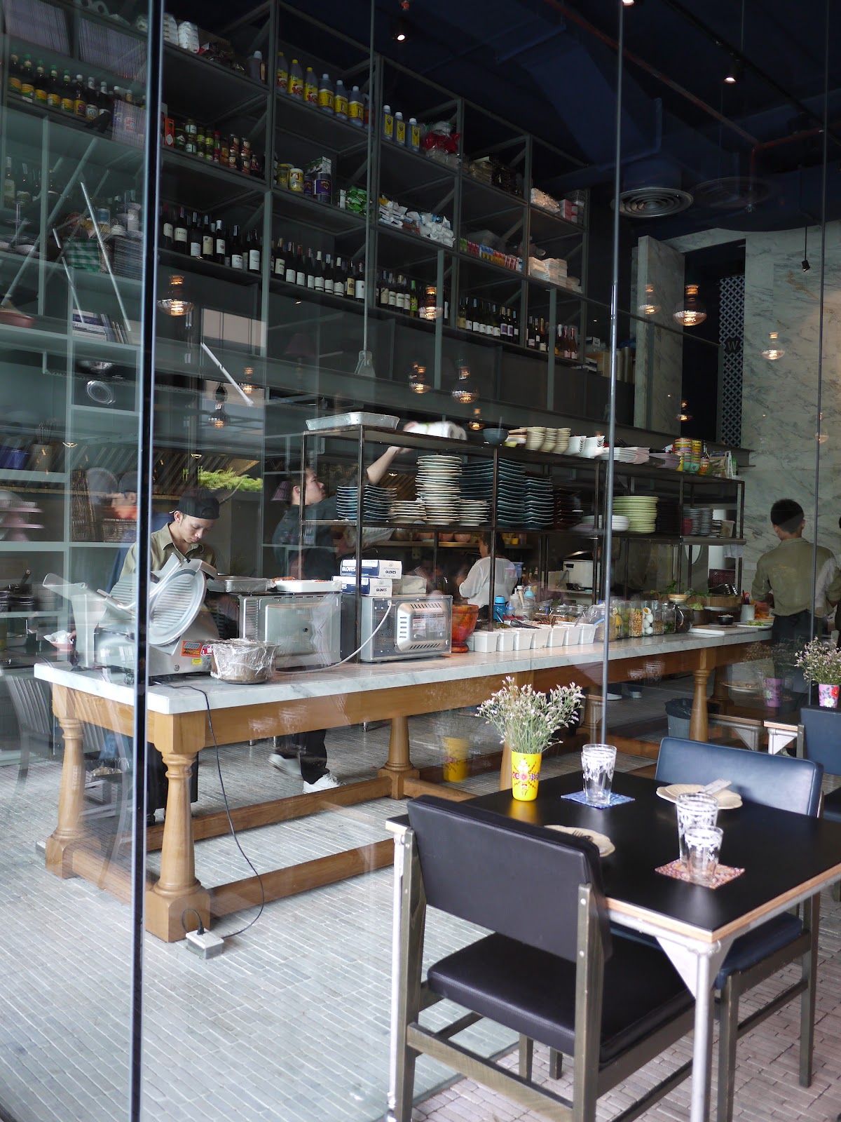 這是個流行開放式廚房的年代,但我還是要讚她厲害,裡面不論是鍋爐還是大廚小廚都讓人不敢小覷,然後你看看那個長條大理石台的木頭桌子,還有背後調味料架,是不是有驚人。