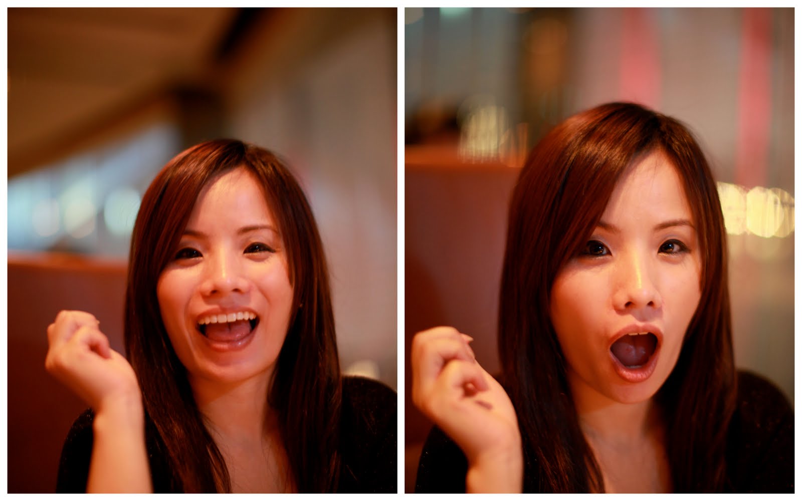 壽星龍一直說我照相表情變化不夠大,人妻很努力的想要附和使用者需求,不過效果明顯不彰,看起來的差異只在於一個是去看耳鼻喉科張嘴巴,一個是去牙科張嘴巴。嘖嘖嘖,後來壽星龍下海示範就像樣多了,一定是自小有在按摩臉部肌肉吧,不然哪裡來的彈性啊!?